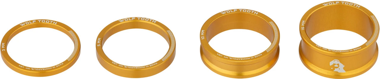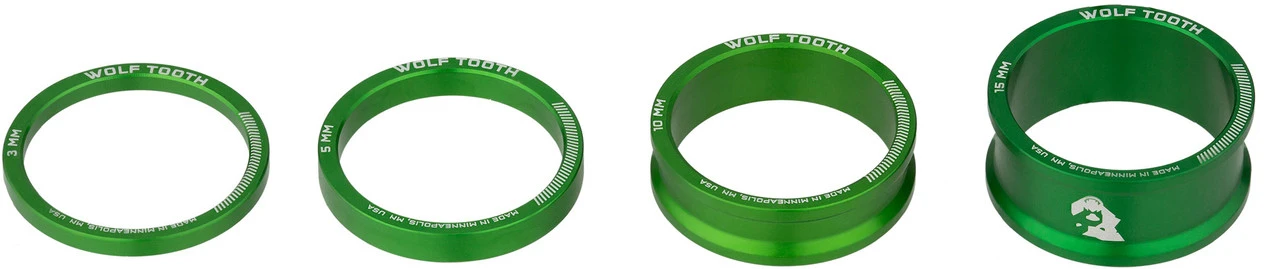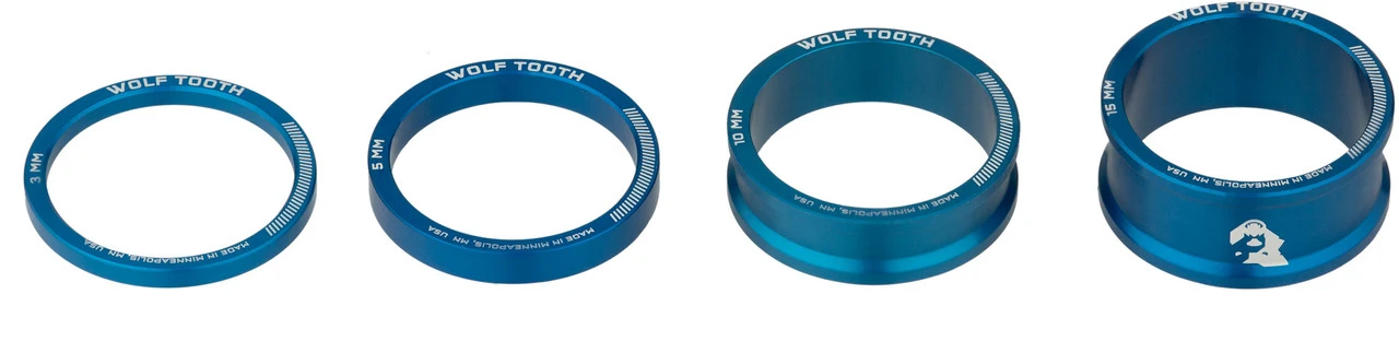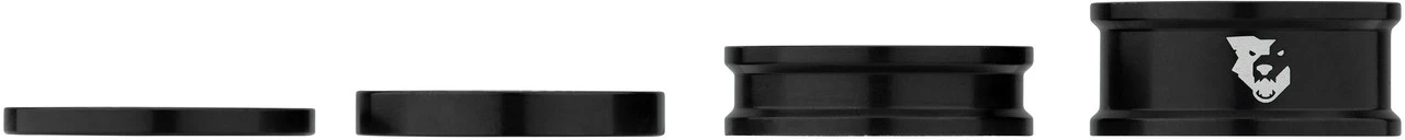 Das Precision Headset Steuersatz Spacer Kit von Wolf Tooth Components besteht aus vier Spacern – je einer mit 3 mm, 5 mm, 10 mm und 15 mm Höhe.